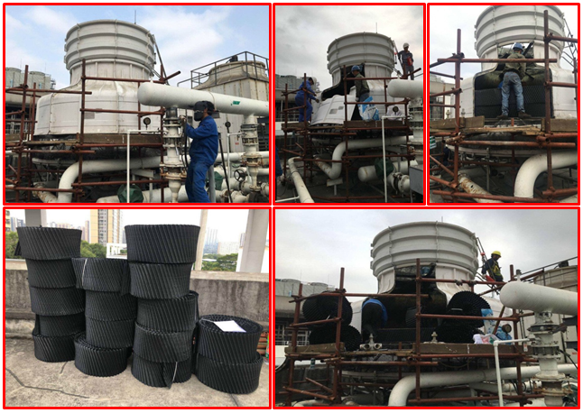 鴻翔花園位于深圳老城區(qū)之一的羅湖蔡屋圍區(qū)松園路。由于冷卻塔使用壽命長,冷卻塔填料老化,需要更換冷卻塔填料。接下來,根據(jù)鴻詳花園圓形冷卻塔填料的更換,介紹了拆卸和更換圓形冷卻塔填料的正確過程。 在清除