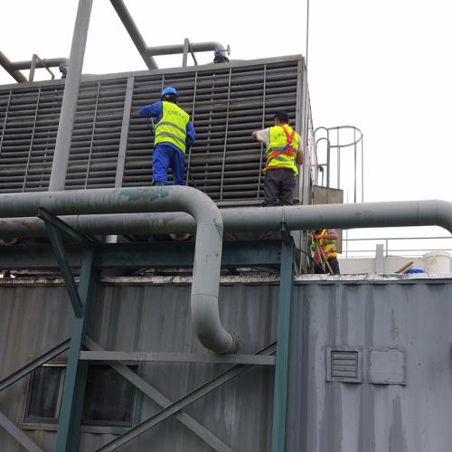 冷卻塔清理,由于冷卻塔暴露于大氣中,運行過程中會有大量的泥沙、藻類等附著于冷卻塔填料表面,不清理干凈會在以后的運行中將這些污垢沖洗到冷卻器內(nèi)造成冷卻器內(nèi)熱交換銅管的堵塞,影響熱交換效果,所以必須對冷卻塔進行徹底清理。