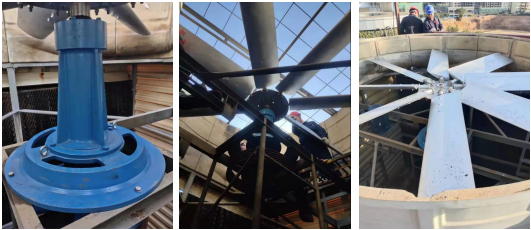 安裝新的冷卻塔超靜音風(fēng)機(jī),拆掉出風(fēng)口消聲器 更換新的冷卻塔不銹鋼接水盤